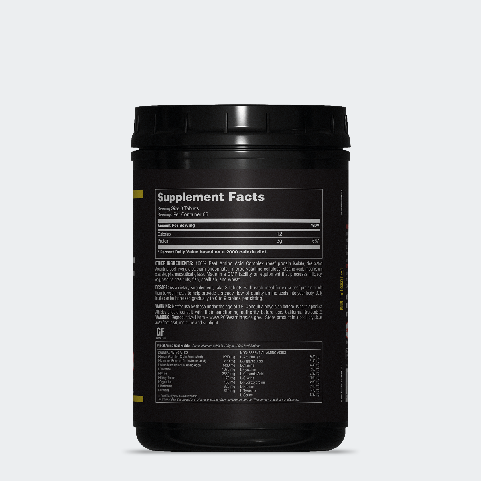 100% Beef Aminos™ is a high potency, natural product derived from the highest quality beef protein isolate and pure desiccated Argentine beef liver. This superior nutritional product contains a full spectrum of key amino acids (EAAs & BCAAs). This formula harnesses the true anabolic potential of beef and is ideal support for anyone looking to add lean mass.